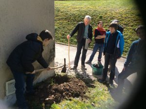 M. Calland de l’association « Les croqueurs de pomme » est intervenu dans le cadre du club jardin pour guider les élèves dans la plantation d’un pied de vigne. Un support avait été préalablement installé par M. Froissard contre le mur sud de la salle des arts. Les élèves présents ont creusé un trou destiné à accueillir le plant issu d’une bouture de variété locale et résistante au mildiou. Après une légère taille des racines pour favoriser la pousse de radicelles, un amendement sous forme de compost et de corne broyée a été apporté avant de reboucher le trou et d’arroser abondamment. Afin de protéger la jeune pousse un cylindre PVC a été installé à sa base.